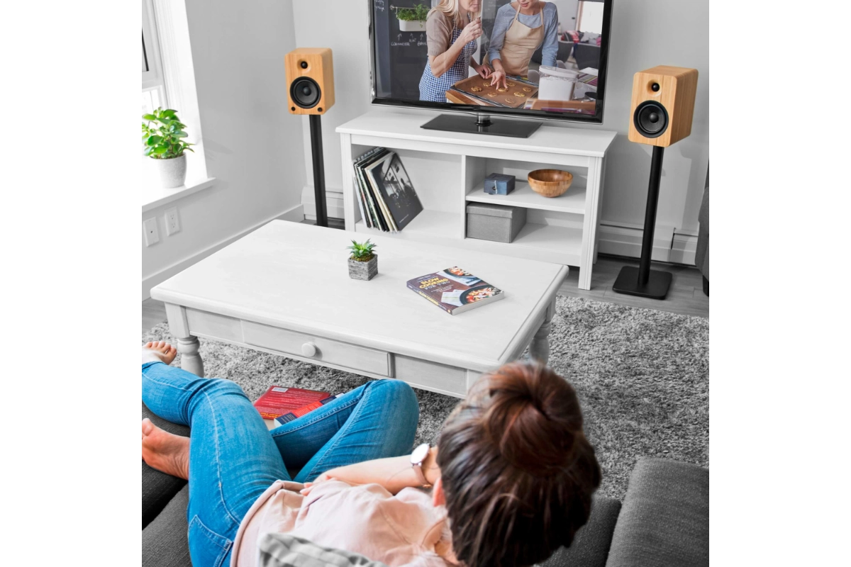 CABLE MANAGEMENT – Conceal your power cable and speaker wire by routing them through the stand’s center column.