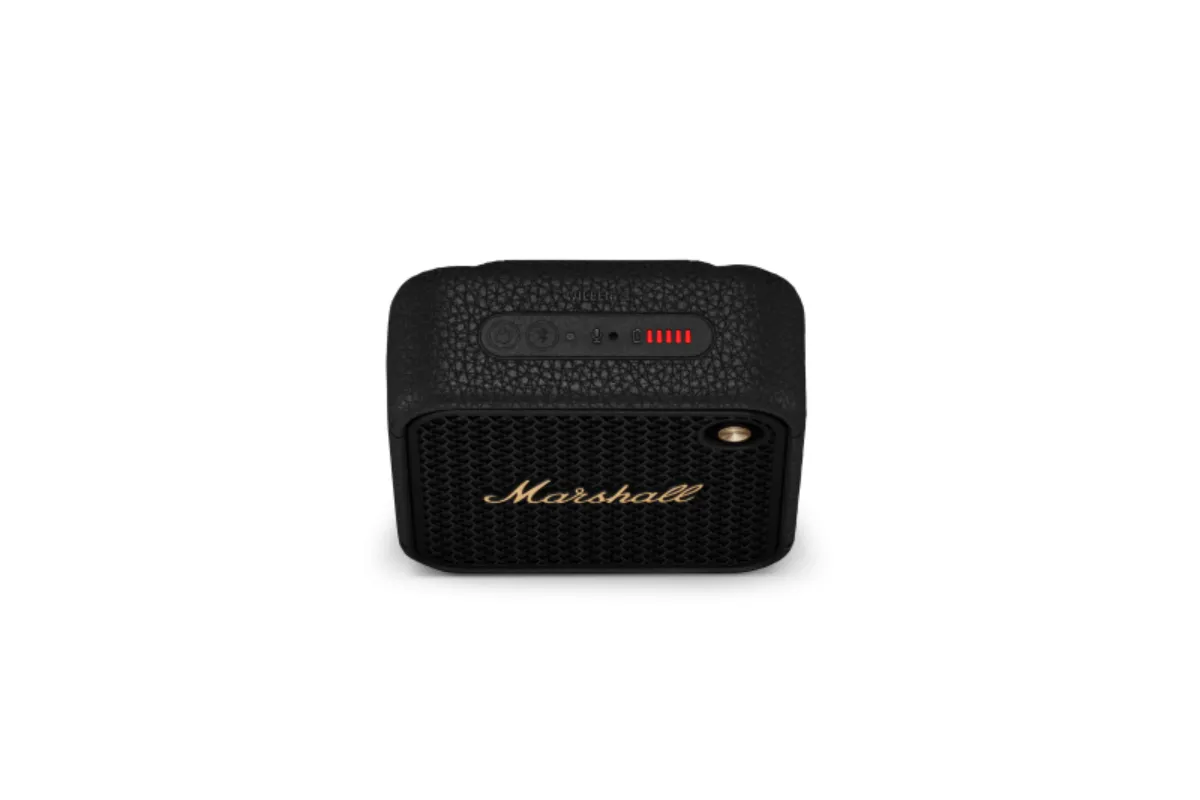 A retro-inspired Marshall Willen Bluetooth speaker, reminiscent of the vibrant style of the 1980s, showcasing classic design elements.