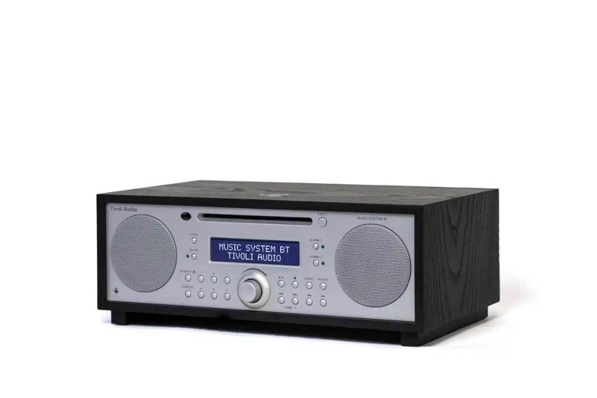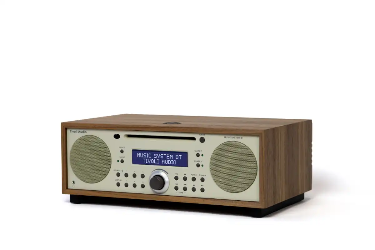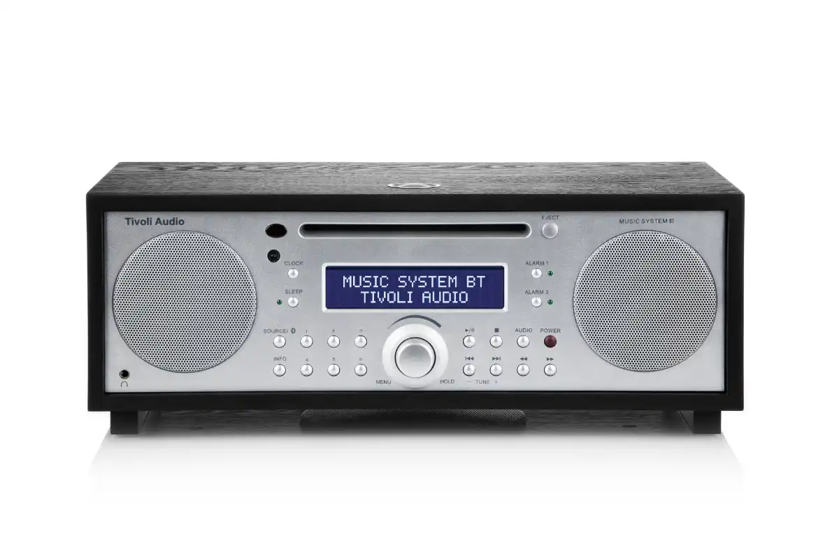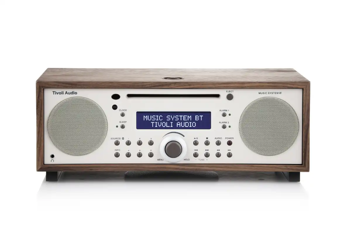 The Tivoli Music System Bluetooth is a compact yet powerful audio system that delivers exceptional sound. It features AM/FM radio, CD playback, and Bluetooth streaming, with enhanced bass from its down-firing subwoofer for a rich stereo experience. It includes an easy-to-read display, digital clock with battery backup, full-function remote control, snooze and sleep timers, and dual independent alarms. All of this is elegantly housed in a hand-crafted, real-wood cabinet, offering you a complete all-in-one audio solution.